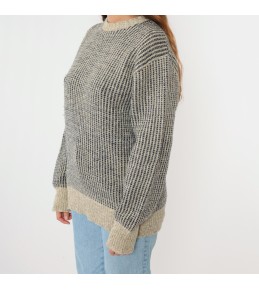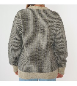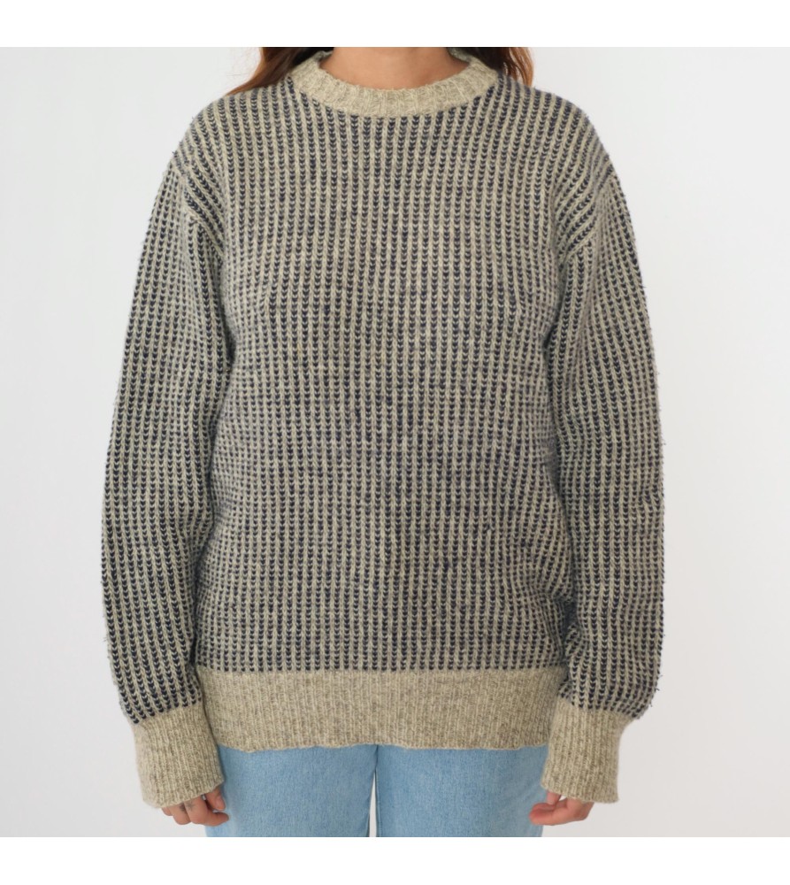 This grey knit sweater is a minimalist staple with elevated texture. The body features a dense, vertical contrast stitch pattern that creates a refined, woven-like look, while the solid ribbed neckline, cuffs, and hem add structure and a clean finish. With an easy, relaxed silhouette and long sleeves, it’s the kind of piece that looks polished with denim yet feels comfortably cozy for everyday wear.