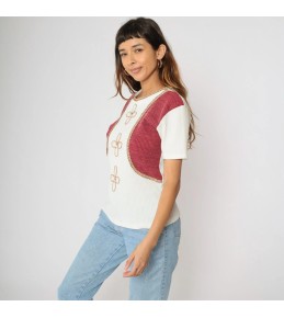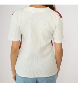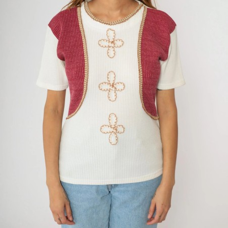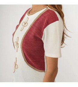 This unique top combines the ease of a ribbed knit tee with the styled look of a layered outfit. The base is a soft white ribbed short-sleeve knit, while the shoulders are finished with a built-in cropped bolero-style overlay in a rich berry tone. Delicate contrast piping outlines the overlay edges for a neat, tailored finish, and the front features three clover-inspired embroidered motifs that add a subtle vintage, feminine touch. One piece, instantly styled—no extra layering required.