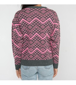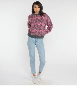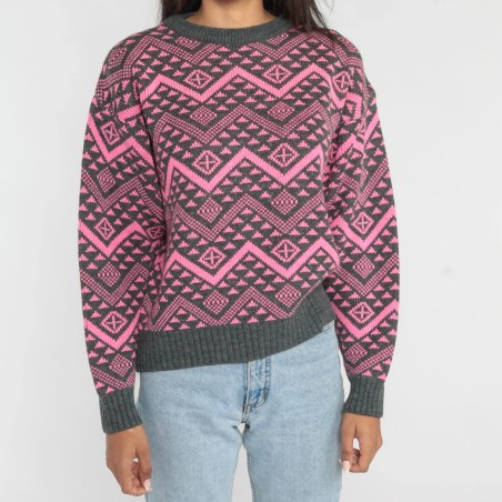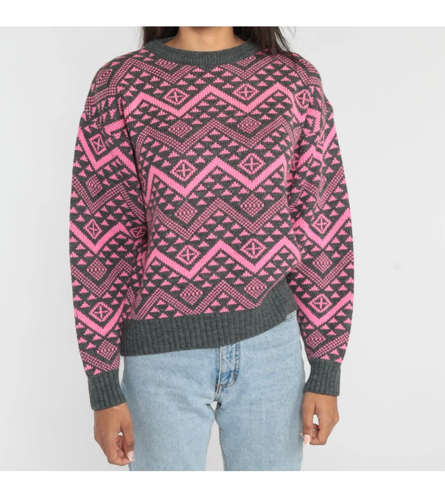 This pink and charcoal knit sweater makes a bold statement with an all-over Fair Isle–inspired geometric design. The pattern mixes chevrons, diamonds, and triangle motifs in high-contrast tones, giving the sweater a modern, graphic look with a cozy winter feel. Finished with a classic crew neckline and solid ribbed trim at the collar, cuffs, and hem, it balances eye-catching detail with a clean, wearable silhouette.