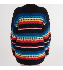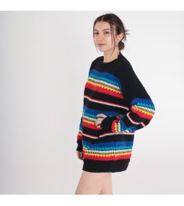 This black knit sweater brings bold color to a classic silhouette with vibrant rainbow striping across the body and sleeves. The multicolor bands are built from a textured, open stitch pattern that adds depth and a handcrafted feel, while the black base keeps the look grounded and easy to style. With a relaxed, slightly longer fit, it’s an effortless statement piece that pairs perfectly with simple denim or solid-color bottoms.